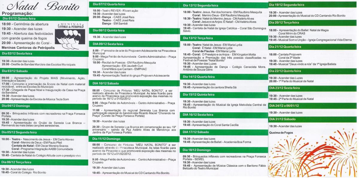 A programação do “Natal Bonito” vai do dia 1º ao dia 31 de dezembro e terá diversas atrações, como música, teatro e concursos culturais. O evento é promovido pela prefeitura de Rio Bonito e conta com o apoio do Fórum Local, que promoverá ações dentro do evento: o concurso de árovres de Natal com material reciclável, dia 3 de dezembro, e a apresentação do “Teatro REVER – R’s em ação” no dia 7.